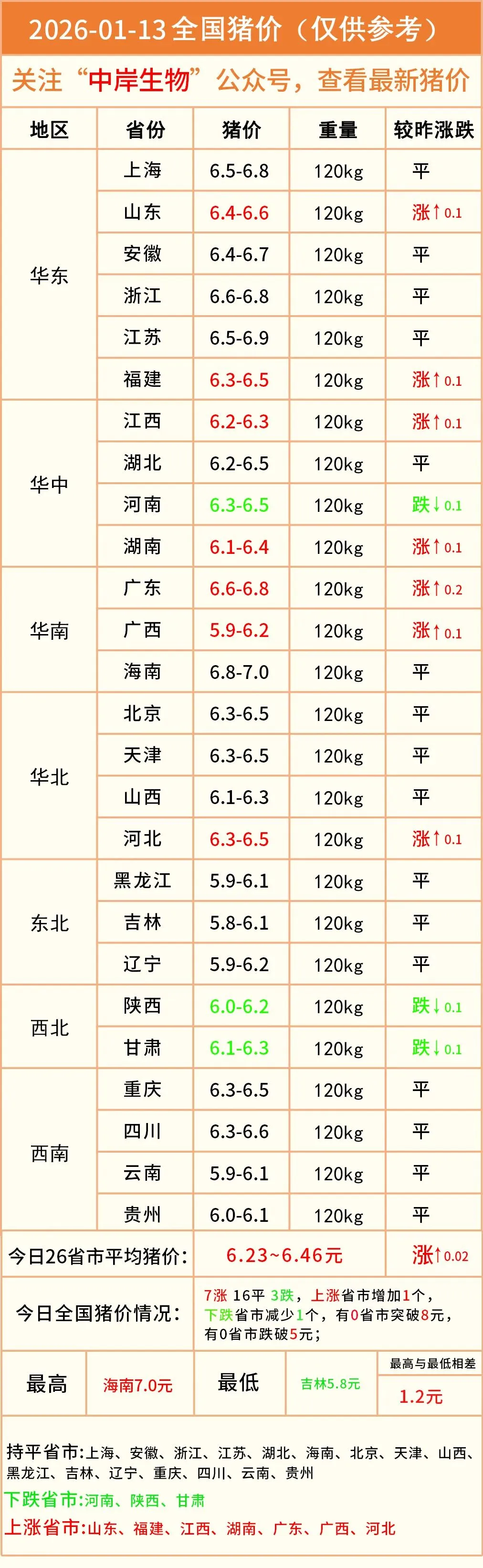 明日猪价|2026-01-13全国最新猪价(猪价已更新!) 养羊网 2026-01-12 明日猪价|2026-01-13全国最新猪价(猪价已更新!)营销中心丨0731-83806009技术服务丨0731-83806019 养羊网 2026-01-12 上一篇:2026.01.13-明天猪价(猪价稳涨、上涨猛回头!年前猪价能继续大幅上涨!) 下一篇:1月12日山东鸡蛋价格 您可能还会对下面的文章感兴趣111: 相关文章 近期价格更新!!! 2025年4月13日全国各地生猪价格信息 盒马无抗蛋到底怎么确认是不是问题鸡蛋! 猪价大预测】1月9~11日!