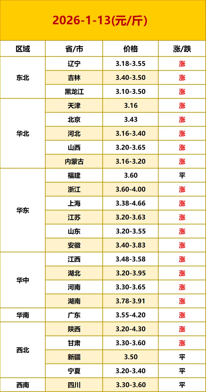 【鸡蛋价格】2026.1.13—最新鸡蛋价格 养羊网 2026-01-13 【鸡蛋价格】2026.1.13—最新鸡蛋价格点击蓝字关注我们吧~ 已关注 关注 重播 分享 赞 视频详情 鸡蛋价格早知道网络报价有高低,仅供参考,不作为你的买卖依据!!! 已关注 关注 重播 分享 赞 视频详情 养羊网 2026-01-13 上一篇:2026年1月12日鸡蛋价格参考 下一篇:2026年1月12日鸡蛋价格上涨 您可能还会对下面的文章感兴趣111: 相关文章 免费领票??5月上海第29届CBE美博会观众登记 别再问千户苗寨值不值得来了 PI会是新的造富神话吗?你如何看待PI的未来 2025年4月13日全国各地生猪价格信息