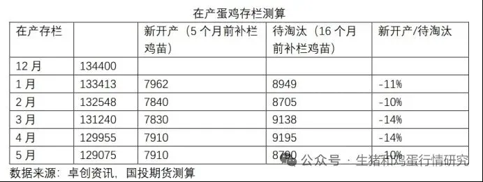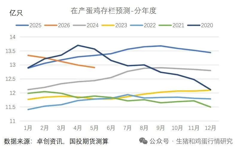 2026年鸡蛋供应的核心变化在于产能去化的持续推进。根据蛋鸡养殖周期推算,2025年下半年的低补栏将直接导致2026年1-5月新开产蛋鸡数量显著减少,叠加老鸡淘汰高峰期集中在一季度,预计在产蛋鸡存栏量将从高位逐步回落,年中有望降至13亿羽以下,过剩产能逐步出清。卓创资讯数据显示,2026年一季度产蛋鸡存栏量理论降幅在0.50%-0.80%,实际产能或因养殖单位出栏意向增强进一步下降 。