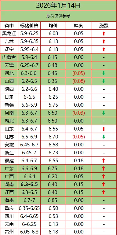 1月14日 猪价早知道 养羊网 2026-01-13 1月14日 猪价早知道?猪价早知道,关注? 养羊网 2026-01-13 上一篇:西南地区鸡蛋价格参考,01月13日 下一篇:2026年1月13日宁城鸡蛋价格早报 您可能还会对下面的文章感兴趣111: 相关文章 近期价格更新!!! 河南淅川核桃书记韩银祥种核桃助农致富 顺丰包邮的小全羊来喽 近期价格更新!!!