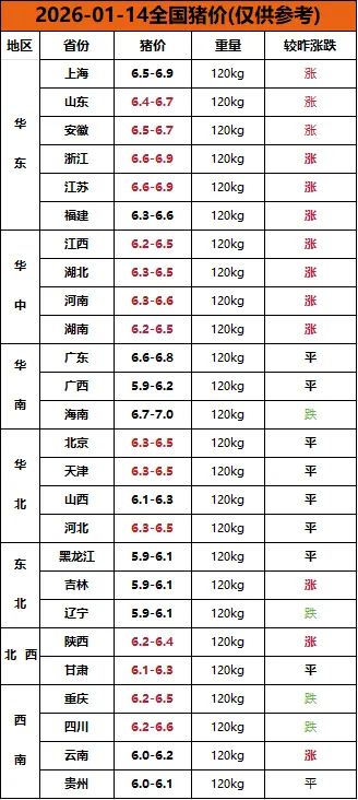 明日猪价|2026.01.14全国猪价(只供参考) 养羊网 2026-01-13 明日猪价|2026.01.14全国猪价(只供参考) 养羊网 2026-01-13 上一篇:【猪价大预测】1月15日~1月18日! 下一篇:稳固回升,猪价继续上涨!仔猪价格一夜暴涨!抢猪大战再次出现! 您可能还会对下面的文章感兴趣111: 相关文章 今天是绝绝紫? 警惕!?"变身记"路边摊的"土鸡蛋 黄金暴涨 9-8的鸡蛋怎么样