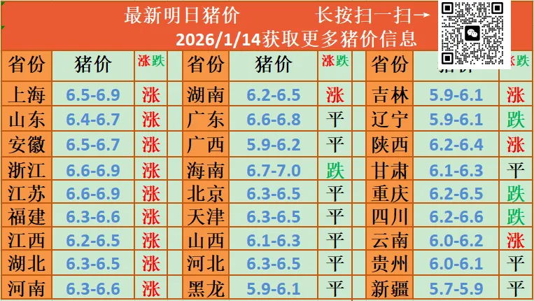 2026.1月14号-最新明日猪价( 全国猪价!) 养羊网 2026-01-13 2026.1月14号-最新明日猪价( 全国猪价!) 养羊网 2026-01-13 上一篇:2026.01.14明日猪价,综合多方因素预测,2026年上半年猪价如何? 下一篇:2026年1月14日 全国猪价 一夜升温!猪价大面积上涨! 您可能还会对下面的文章感兴趣111: 相关文章 土鸡蛋贵背后的秘密 2025年4月13日全国各地生猪价格信息 2025年4月13日全国各地生猪价格信息 近期价格更新!!!