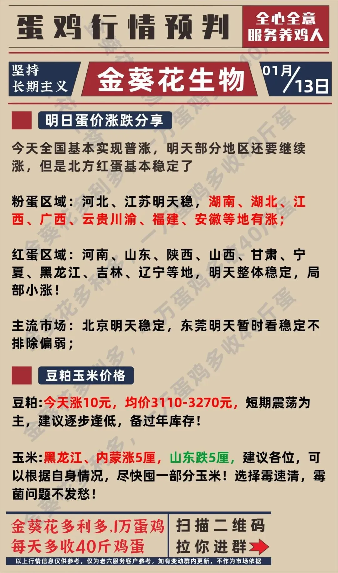 今天北京主流再涨,产区大部分地区跟涨,北方红蛋黑龙江等地,南方粉蛋湖北等地提前稳定,预计明天北京开始稳定,产区整体也是止涨企稳,本轮涨价基本结束,产区均价基本上达到了3.5