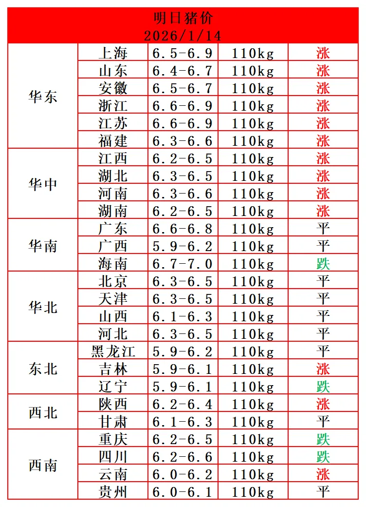 2026.1.14-明日猪价(步步高升,猪价继续飘红!) 养羊网 2026-01-14 2026.1.14-明日猪价(步步高升,猪价继续飘红!) 养羊网 2026-01-14 上一篇:1月13日猪价供需双低 上涨势头疲软 下一篇:明日猪价(1月14日) 您可能还会对下面的文章感兴趣111: 相关文章 1月20日全国规模场出栏猪价VS散户出栏猪价 2025年4月13日全国各地生猪价格信息 股票的内在价值是一个变量 一亩地赚两亩的钱!鱼菜共养、藕虾套养技术简单效益高
