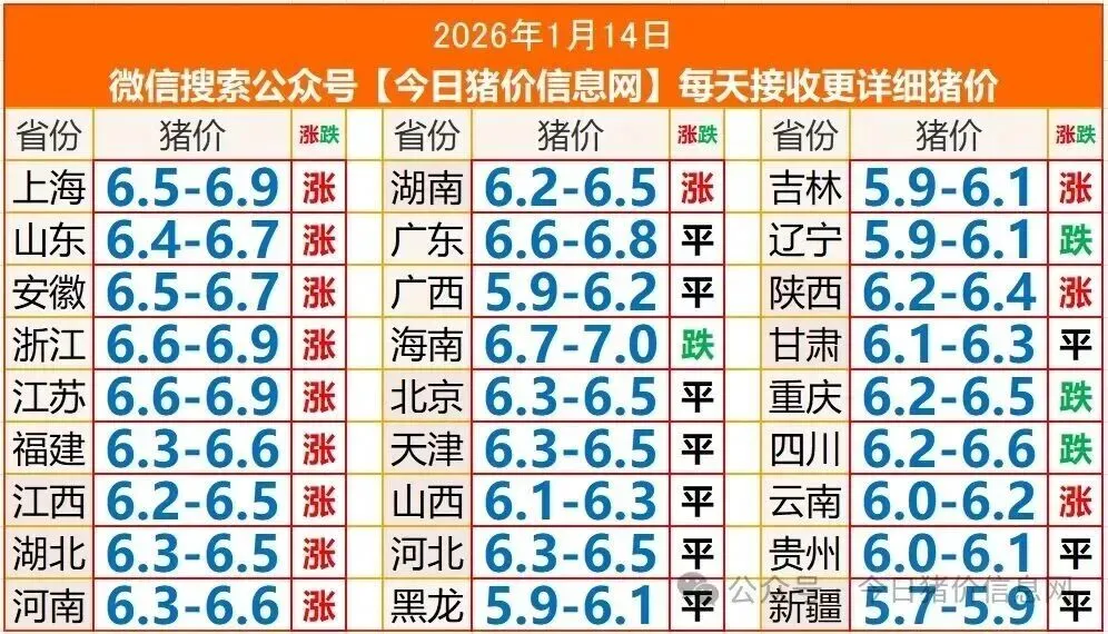 2026年1月14日全国猪价行情表 养羊网 2026-01-14 2026年1月14日全国猪价行情表来源:今日猪价信息网 养羊网 2026-01-14 上一篇:1月14日 | 正业生物猪价快报! 下一篇:【涨!】2026年1月14日鸡蛋价格,仅供参考 您可能还会对下面的文章感兴趣111: 相关文章 往北海道大學走的路上直接walk in的店 冬季羊螨虫防治技巧有哪些?用什么药最好? 0.01鸡蛋 到货十一箱,还有六箱在路上 Hyde Park超便宜鸡蛋