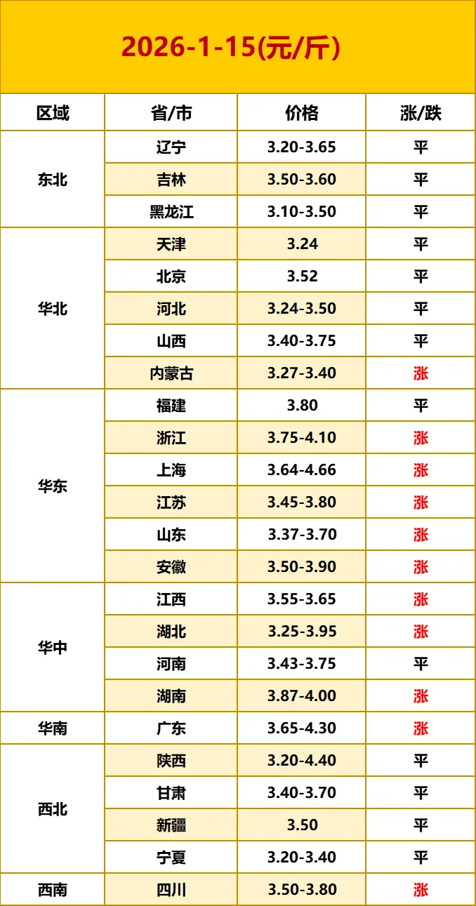 【鸡蛋价格】2026.1.15—最新鸡蛋价格 养羊网 2026-01-15 【鸡蛋价格】2026.1.15—最新鸡蛋价格点击蓝字关注我们吧~ 已关注 关注 重播 分享 赞 视频详情 鸡蛋价格早知道网络报价有高低,仅供参考,不作为你的买卖依据!!! 已关注 关注 重播 分享 赞 视频详情 养羊网 2026-01-15 上一篇:猪价今日猪价行情价格表 | 2026.1.15最新今日猪价格表行情走势分析 下一篇:从亏80到涨两毛:1月猪价反转,春节前能冲7元/斤吗? 您可能还会对下面的文章感兴趣111: 相关文章 8.5 20个鸡蛋 2025年7月16日全国各地生猪价格信息 2026年1月2日全国鸡蛋价格汇总(参考) 2025年4月13日全国各地生猪价格信息
