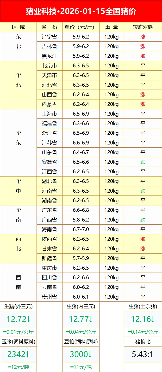 2026-01-15明日猪价 养羊网 2026-01-15 2026-01-15明日猪价? ?别忘了点个在看哦? 养羊网 2026-01-15 上一篇:1月15最新猪价 北强南稳 下一篇:2026年1月15日的猪价相关情况 您可能还会对下面的文章感兴趣111: 相关文章 近期价格更新!!! 2025年4月13日全国各地生猪价格信息 2025年4月13日全国各地生猪价格信息 新手必看!科学养羊超全攻略来啦羊咩??