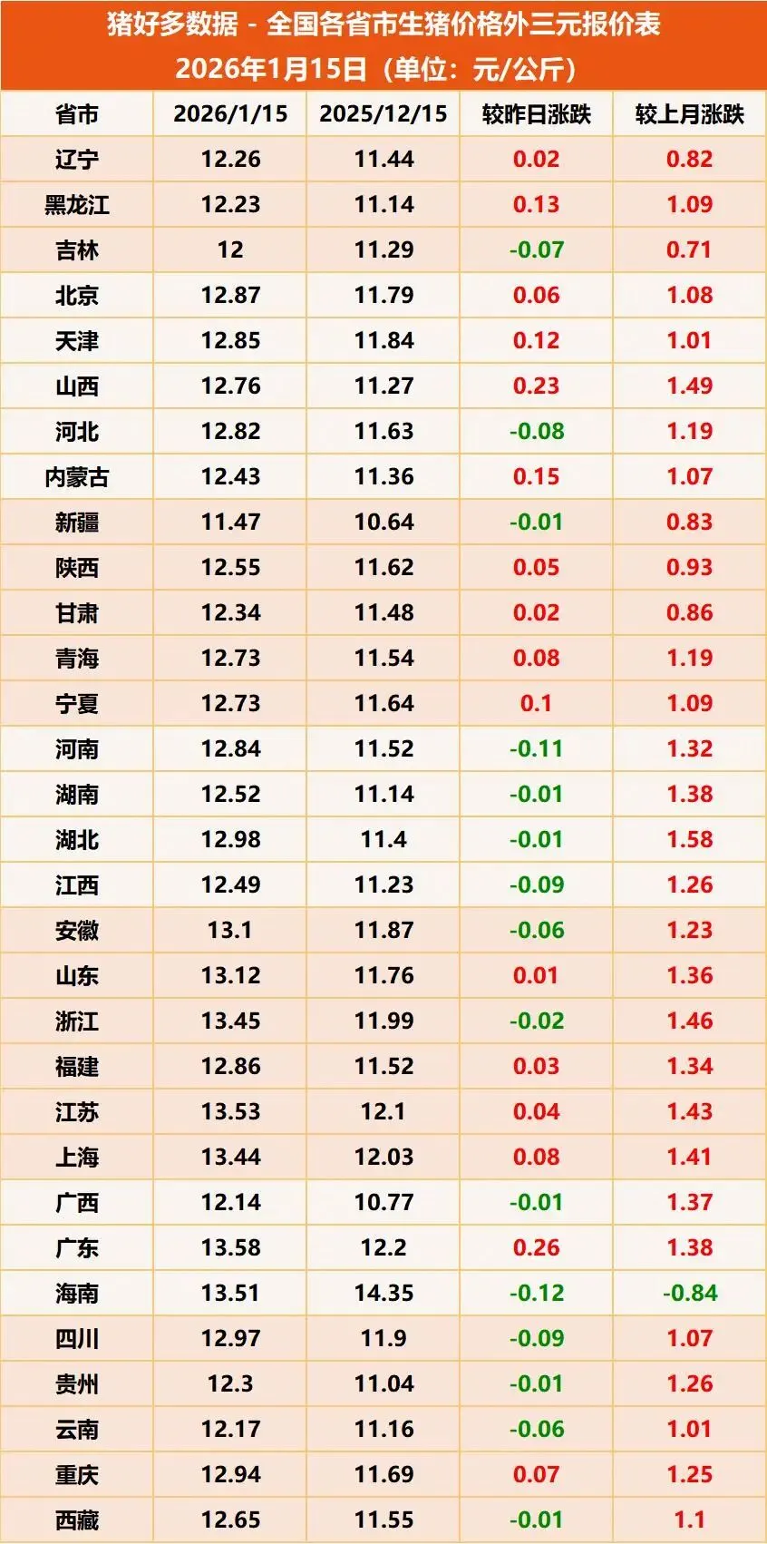 1月份以来,猪价持续震荡走强,全国生猪均价重心也随之不断上移!据猪好多数据监测显示,2026年1月15日全国外三元生猪均价为12.71元/公斤,较昨日上涨0.03元/公斤,较上月同期(12月15日)上涨1.13元/公斤,环比涨幅达9.76%。