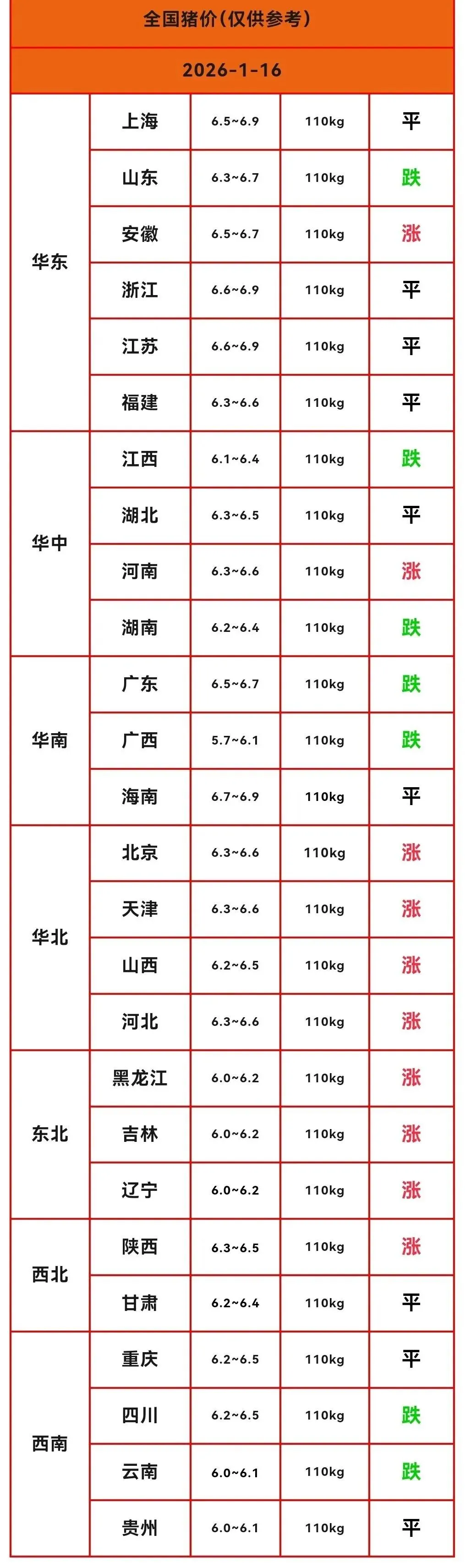 下面是明天(2026年1月16日)的外三元标猪均价,养殖朋友们可以参考!