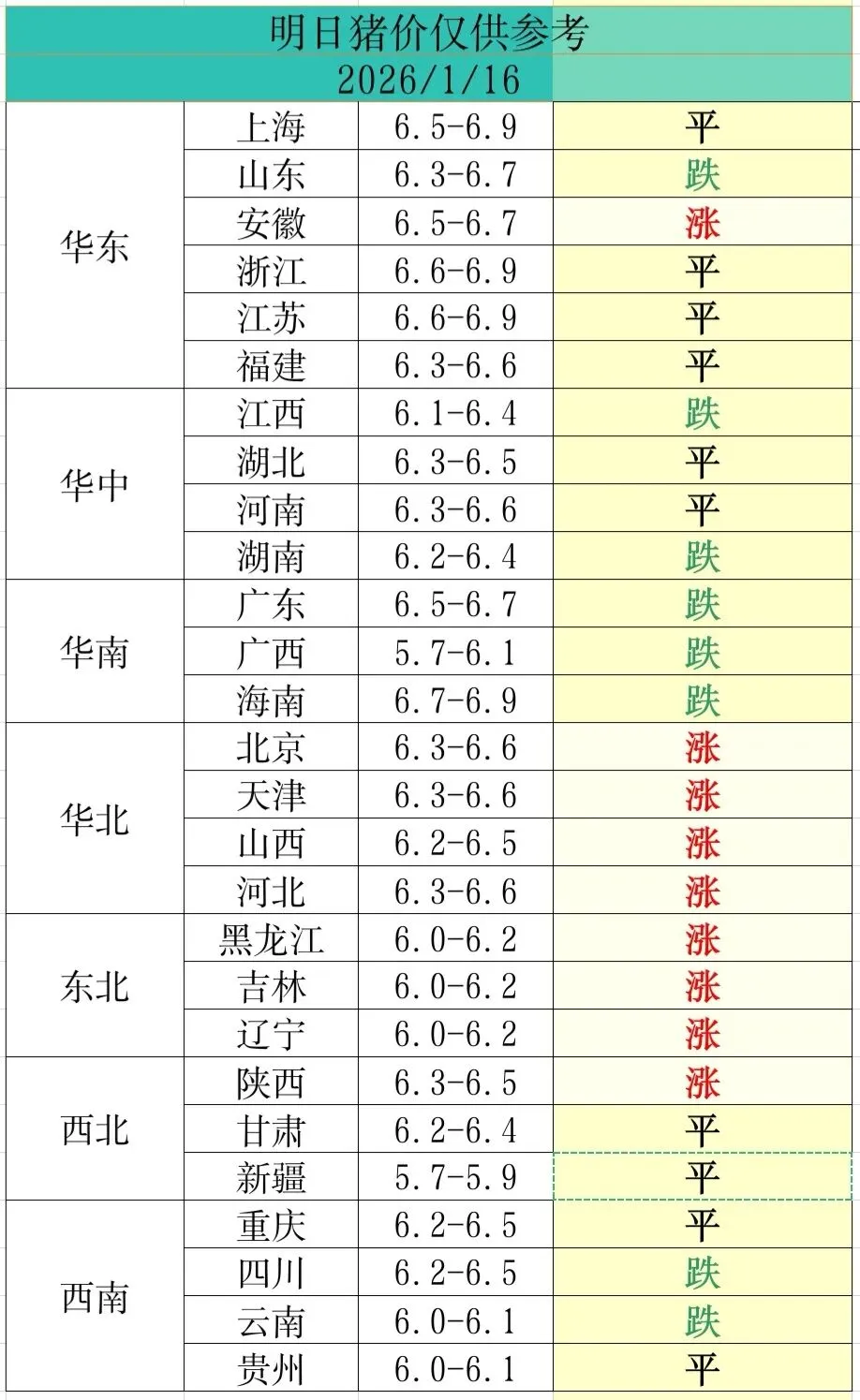 2026年1月16日全国猪价信息/供大家参考 养羊网 2026-01-15 2026年1月16日全国猪价信息/供大家参考 养羊网 2026-01-15 上一篇:1月15日猪价速递 下一篇:2026.1.16明日全国最新猪价 您可能还会对下面的文章感兴趣111: 相关文章 美国鸡蛋?价钱 day 5?? 近期价格更新!!! 涨跌调整!猪价今日猪价行情价格表 | 2026.1.9最新今日猪价格表行情走势分析 近期价格更新!!!