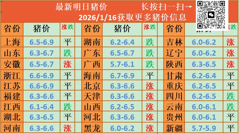 2026.1月16号-最新明日猪价( 全国猪价!) 养羊网 2026-01-15 2026.1月16号-最新明日猪价( 全国猪价!) 养羊网 2026-01-15 上一篇:【明天猪价】 2026. 01. 16 缺猪了!北方猪价持续上涨!! 下一篇:【明天猪价】 2026. 01. 16 缺猪了!北方猪价持续上涨!! 您可能还会对下面的文章感兴趣111: 相关文章 山东平阴地瓜状元尹忠祚的红薯种植致富经 这一包鸡蛋让我整个星期都幸福了 2025年4月13日全国各地生猪价格信息 鸡蛋短期:还有下行空间