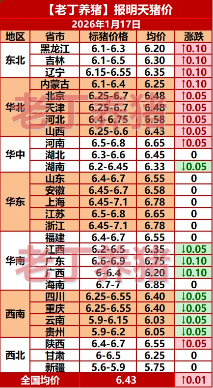 猪价有涨!【明天猪价】1月17日全国猪价涨跌表!关注老丁养猪