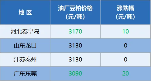 今日全国重要地区油厂豆粕(43%蛋白)价格