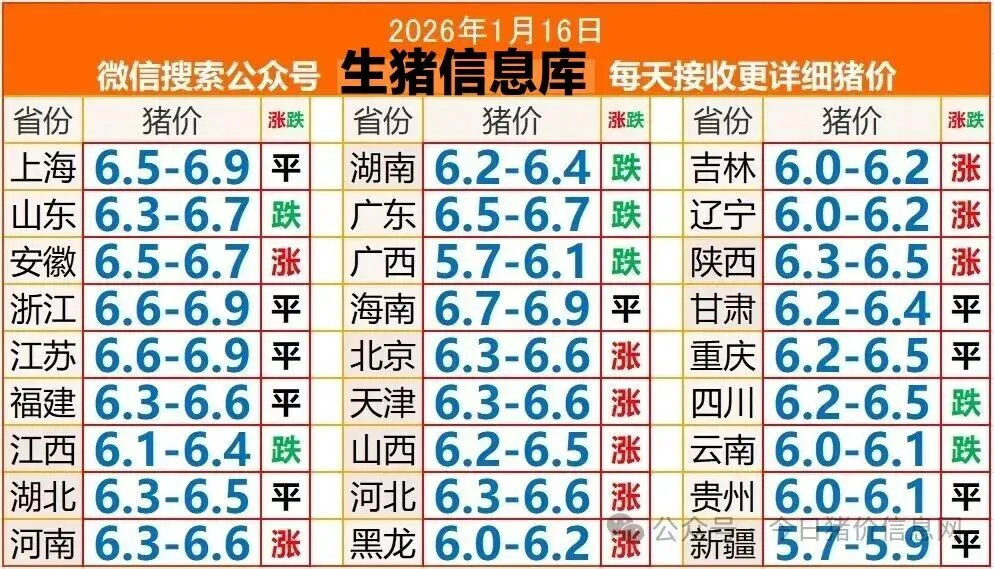 涨价26.01.16猪价 养羊网 2026-01-16 涨价26.01.16猪价 养羊网 2026-01-16 上一篇:【超前猪价大预测】1月17~1月19日!全国猪价 下一篇:【明天猪价】2026.01.16全国猪价 (东北猪价延续上涨!) 您可能还会对下面的文章感兴趣111: 相关文章 各行业毛利润 2025年4月13日全国各地生猪价格信息 2025年4月13日全国各地生猪价格信息 近期价格更新!!!
