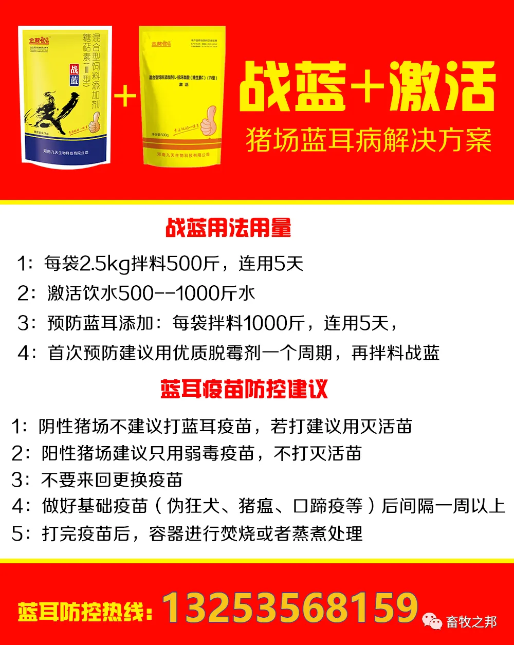 已关注关注重播 分享 赞辽宁锦州黄大哥说保育猪出现消瘦、炸毛、喘,喂了战蓝套装4天,小猪就恢复正常了,现在小猪胖乎乎的毛还顺溜,大哥说感谢公司的研发团队,出这么好的产品! 【战蓝套装】:每套(1袋战蓝+1袋激活)已关注关注重播 分享 赞用法用量:净化预防拌料1000斤,治疗拌料500斤,连用7天。3-5天咳喘症状减轻,耳朵身上颜色变浅,采食量增加,7天控制病情,猪炸消瘦情况逐渐恢复正常。