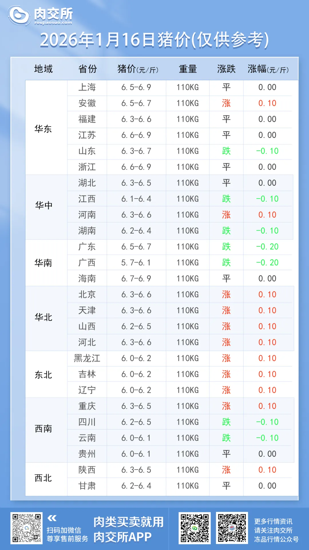 【猪价】2026年1月16日全国最新猪价!上涨区域集中发力:华北(北京、天津、山西、河北)全区域涨 0.1 元 / 斤,东北(黑龙江、吉林、辽宁)全区域涨 0.1 元 / 斤,西北陕西、西南重庆、华东安徽、华中河南同步小涨 0.1 元 / 斤; 商务合作、新闻爆料等? 联系方式:15865155789