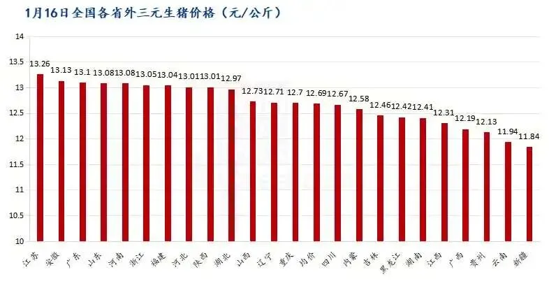 今天全国外三元生猪出栏均价为12.69元/公斤,较昨日上涨0.02元/公斤,最低价新疆11.84元/公斤,最高价江苏13.26元/公斤。