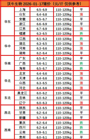 ? ?猪价播报沃小牛,助力养猪牛牛牛!各位养猪的老铁们,大家好!我是沃小牛,明天是2026年01月17日,最新猪价已经出来了:明天全国猪价整体走势为稳中偏强,窄幅调整。北方看稳或小涨,南方偏稳,需警惕南方价格松动。市场呈现“北涨南跌”的分化。东北、华北受天气和养殖户惜售影响,价格坚挺;而华南、西南地区因腌腊需求结束,消费进入空窗期,价格承压下跌。春节前趋势的整体判断是底部小幅抬升,但上涨空间有限。 核心制约依旧是供应充足,消费提振力度一般。对于养猪人来讲,密切关注所在区域的价格动态和集团企业的出栏节奏,顺势出栏、避免在节前形成集中出栏高峰,是更为稳妥的策略。