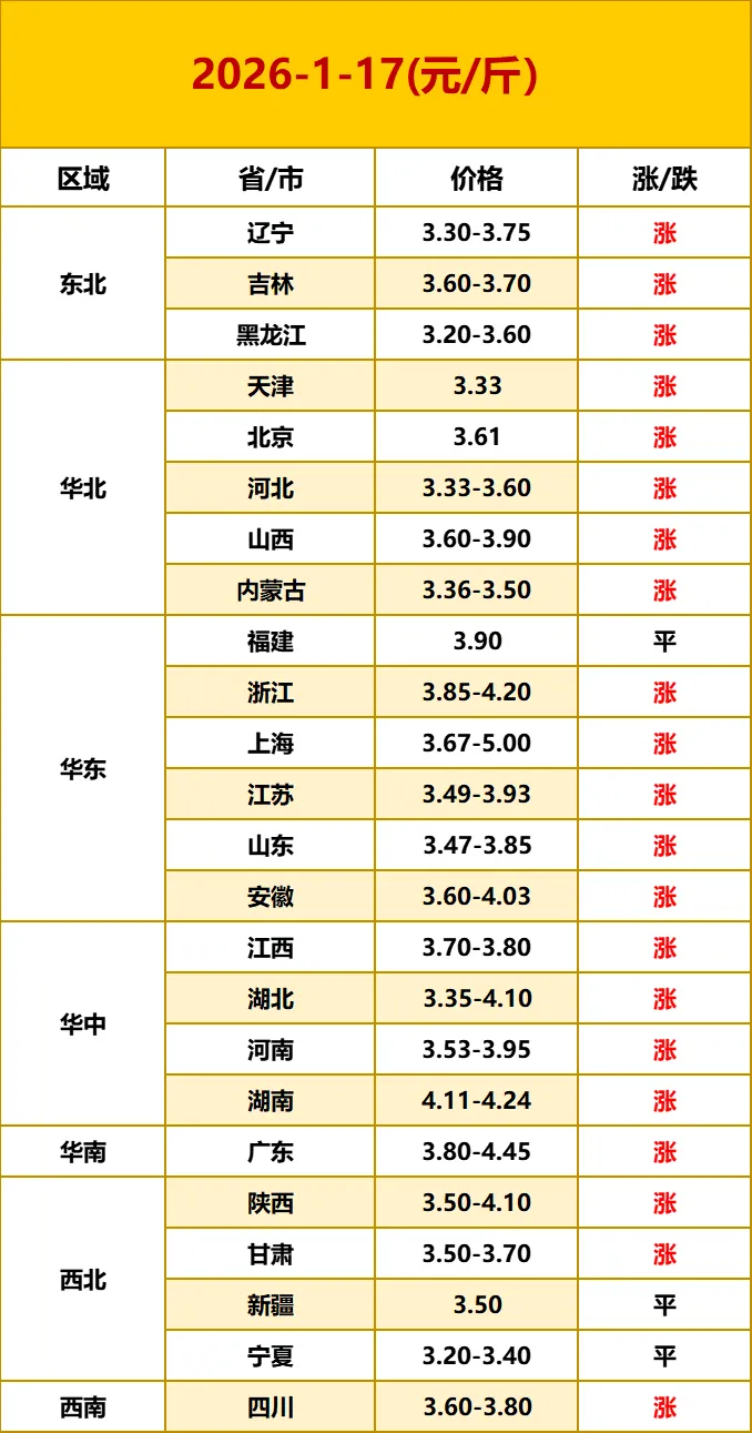 【鸡蛋价格】2026.1.17—最新鸡蛋价格 养羊网 2026-01-16 【鸡蛋价格】2026.1.17—最新鸡蛋价格点击蓝字关注我们吧~ 已关注 关注 重播 分享 赞 视频详情 鸡蛋价格早知道网络报价有高低,仅供参考,不作为你的买卖依据!!! 已关注 关注 重播 分享 赞 视频详情 养羊网 2026-01-16 上一篇:猪价上涨“拦不住”!北方猪价飙涨13元/斤!屠宰场连夜抢猪、冻肉库存压垮南方市场! 下一篇:猪价又变了!2026.1.17全国各地生猪价格信息 您可能还会对下面的文章感兴趣111: 相关文章 25甘肃工会,小道消息,有点心疼今年考生 立体种植,植物工厂 1.18有哥供应链早知道 上涨通道再次开启,猪价能一飞冲天吗?看完心里有数了!