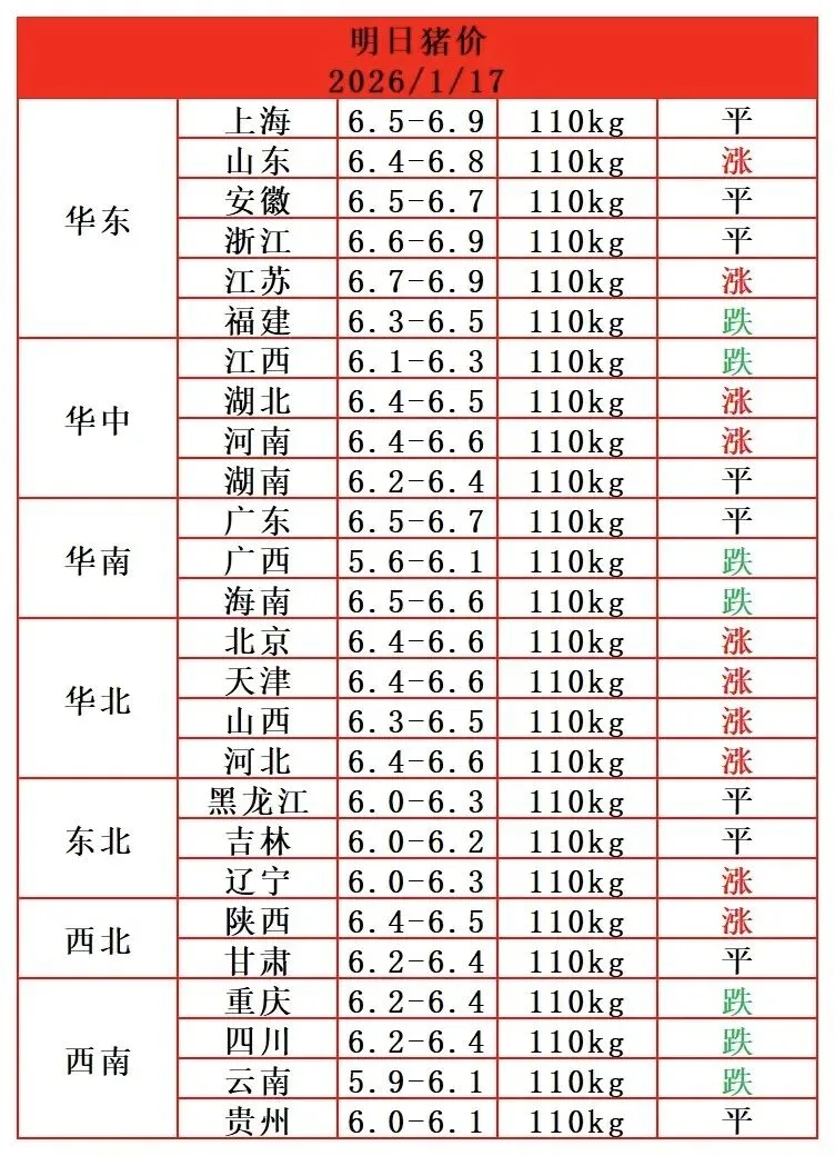 明日猪价1.17日 养羊网 2026-01-16 明日猪价1.17日肥可壮年底活动中,买一件送一件欢迎扫码关注! 养羊网 2026-01-16 上一篇:生猪:猪价短时有支撑,关注企业出栏节奏 下一篇:明天猪价—2026.01.17持续震荡 您可能还会对下面的文章感兴趣111: 相关文章 2025年4月13日全国各地生猪价格信息 工厂的赚钱秘密?? 大马生猪肉全球最贵! 2026年1月6日鸡蛋价格早报