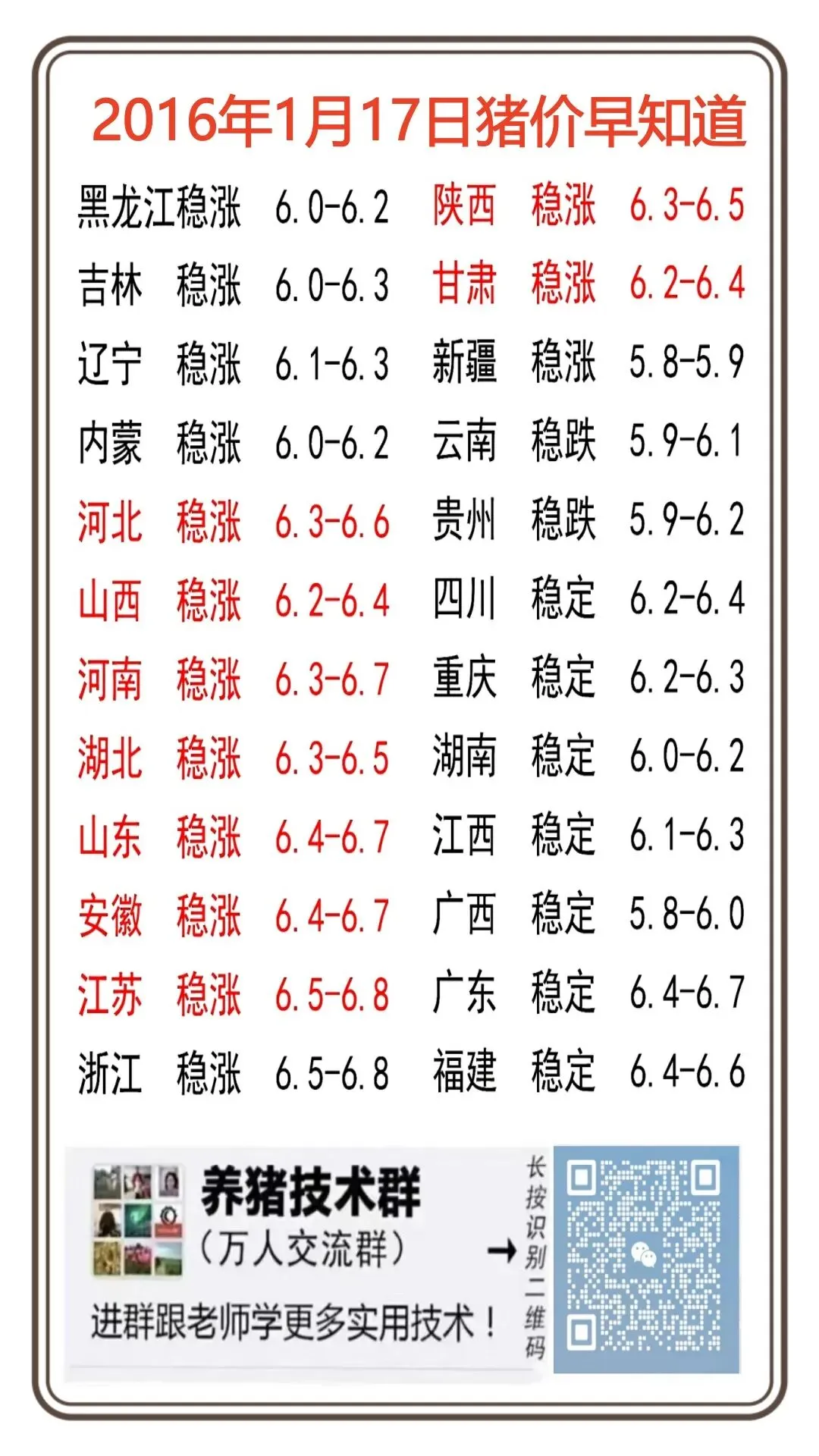 涨!涨!!2026年1月17日多省猪价连涨! 养羊网 2026-01-16 涨!涨!!2026年1月17日多省猪价连涨! 养羊网 2026-01-16 上一篇:明日猪价(1月17日) 下一篇:【明天猪价】2026.1.17全国猪价已更新) 您可能还会对下面的文章感兴趣111: 相关文章 一起来了解不同品种的内蒙羊? 生孩子到底需要准备多少存款? 近期价格更新!!! 近期价格更新!!!