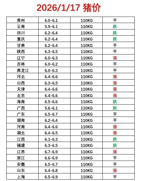 2026.1.17猪价出来了 养羊网 2026-01-16 2026.1.17猪价出来了关注主播,每天更新最新猪价养猪技术咨询;15656542232 养羊网 2026-01-16 上一篇:2026.1.17明日猪价行情 下一篇:统贺饲料│(2026.1.17)明日猪价早知道 您可能还会对下面的文章感兴趣111: 相关文章 2025年4月13日全国各地生猪价格信息 山东蒙阴来料加工能挣钱成农民致富好项目 2025年4月13日全国各地生猪价格信息 近期价格更新!!!