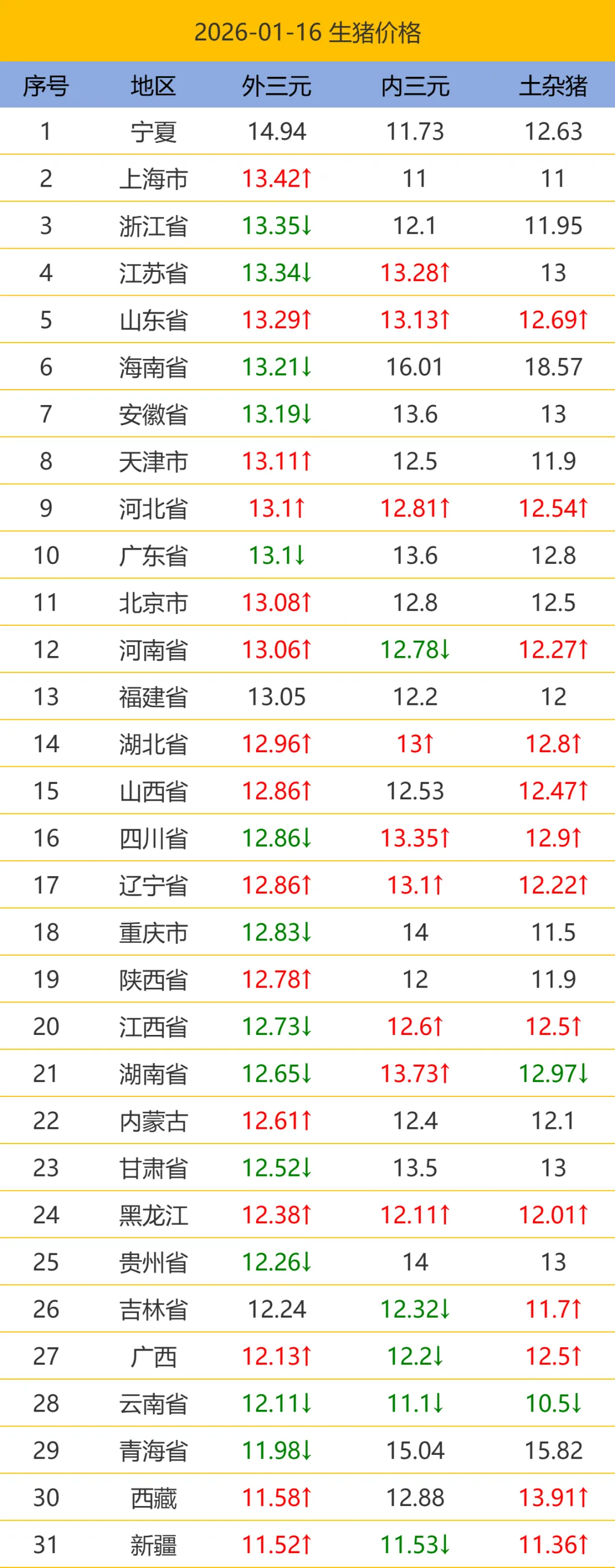 今日猪价.2026.01.16最新生猪价格/期货猪价 养羊网 2026-01-16 今日猪价.2026.01.16最新生猪价格/期货猪价以下猪价为平均价格(单位:元/公斤),仅供参考。 养羊网 2026-01-16 上一篇:【明天猪价】1月17日国猪价(已更新!) 下一篇:2026.1.17-明日猪价 您可能还会对下面的文章感兴趣111: 相关文章 有些钱就该人家赚啊…… 近期价格更新!!! 2025年4月13日全国各地生猪价格信息 年轻人有自己的鸡蛋可领