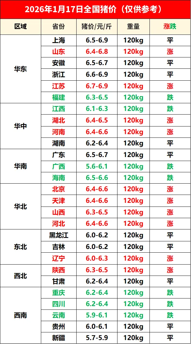 1月17日全国猪价多地继续上涨! 养羊网 2026-01-17 1月17日全国猪价多地继续上涨! 养羊网 2026-01-17 上一篇:2026年月17日-最新猪价(涨涨涨!千万别停!多地飘红上涨!) 下一篇:1月17日今日猪价牛价玉米价小麦价大米价 粮食价格信息 您可能还会对下面的文章感兴趣111: 相关文章 2025年7月21日全国各地生猪价格信息 近期价格更新!!! 第39篇:什么是【猪周期】? 山姆涨价涨疯了?! 卓越会员还能续费么?