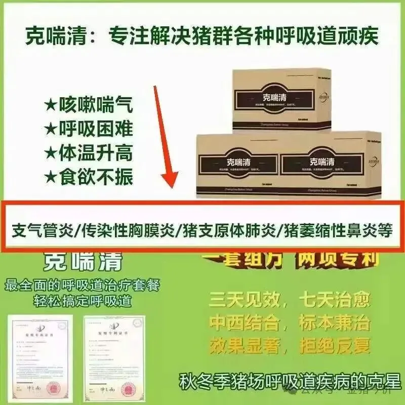 2、猪场呼吸道防控方案——克喘清 组方双专利技术工艺,治咳喘三天见效,七天治愈 ↓ 规格:一件8套,一套5包拌料400斤治疗,800斤预防,连用7天。 政策:5件送1件、10件送3件、20件送7件、40件送20件。 如有活动还能再赠送