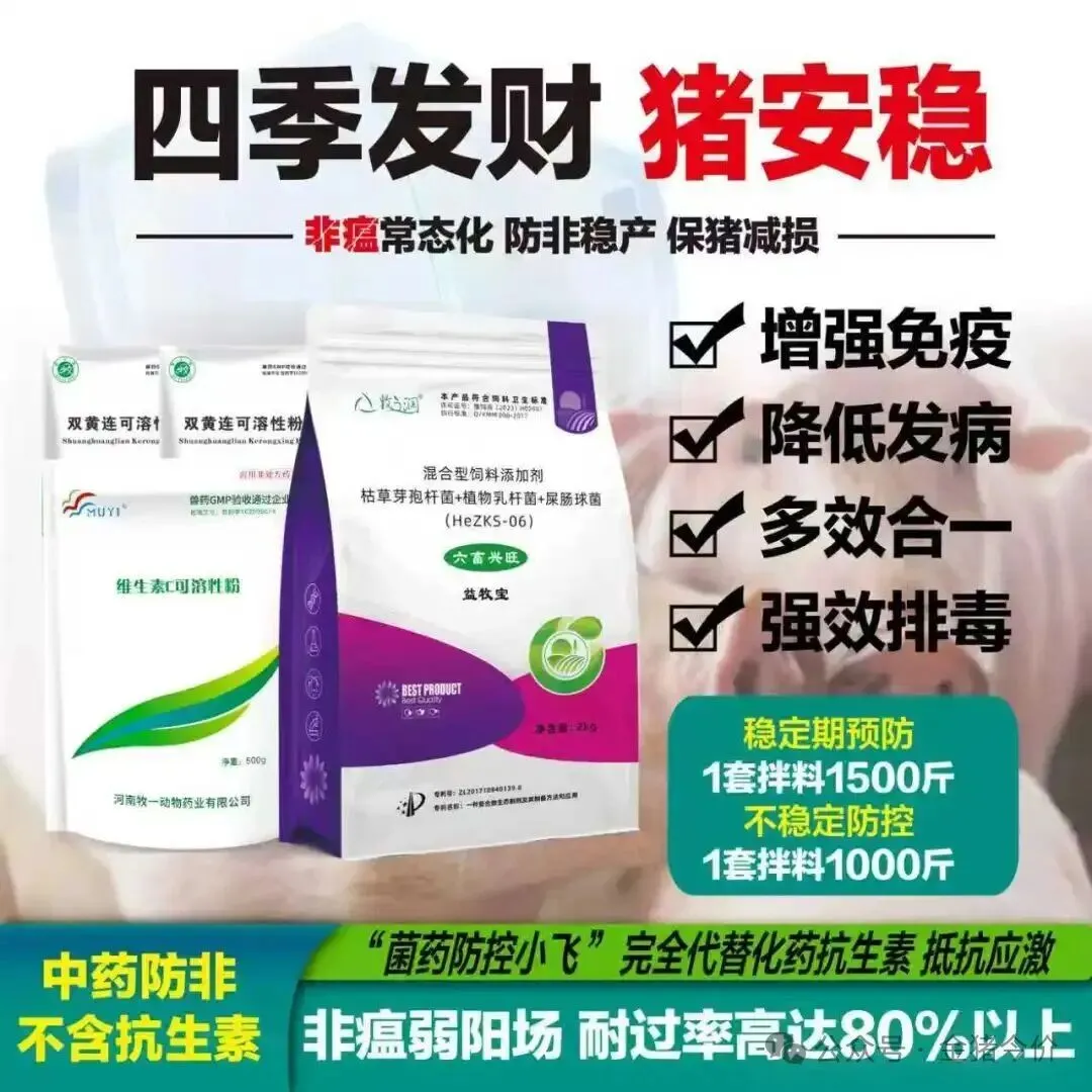10、防非“菌药”套餐?控非洲猪瘟,阻断传播,弱阳小飞耐过率高达80%以上,保护大群!↓ 规格:一套4袋、一套拌料1000-1500斤, 政策:5袋送1袋