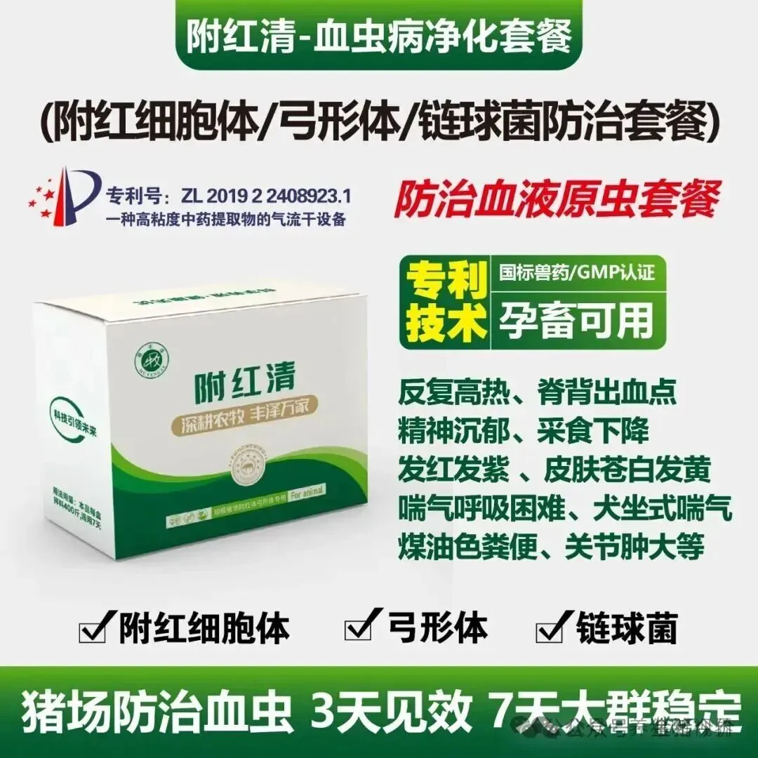 12、附红清—猪场血虫病防治套餐,孕畜可用(附红细胞体弓形体链球菌)↓ 规格:一件8套、一套4包拌料400-800斤,连用7天。 政策:3送1
