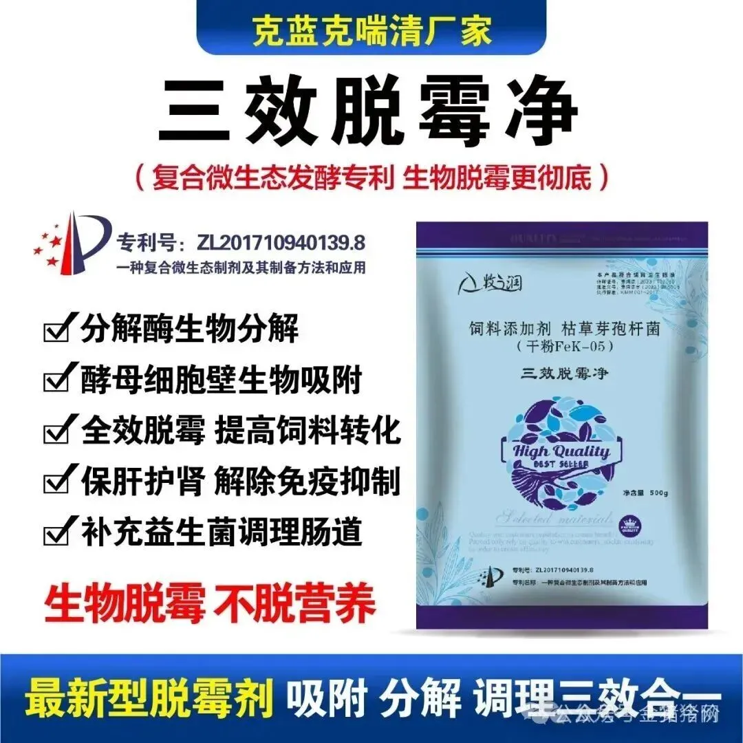 13、三效脱霉净——专利技术复合微生态脱霉剂,不含蒙脱石保护干肾↓ 规格:一件20袋,一袋500克,拌料1000斤 政策:5袋送1袋,一件送4袋,5件送1件