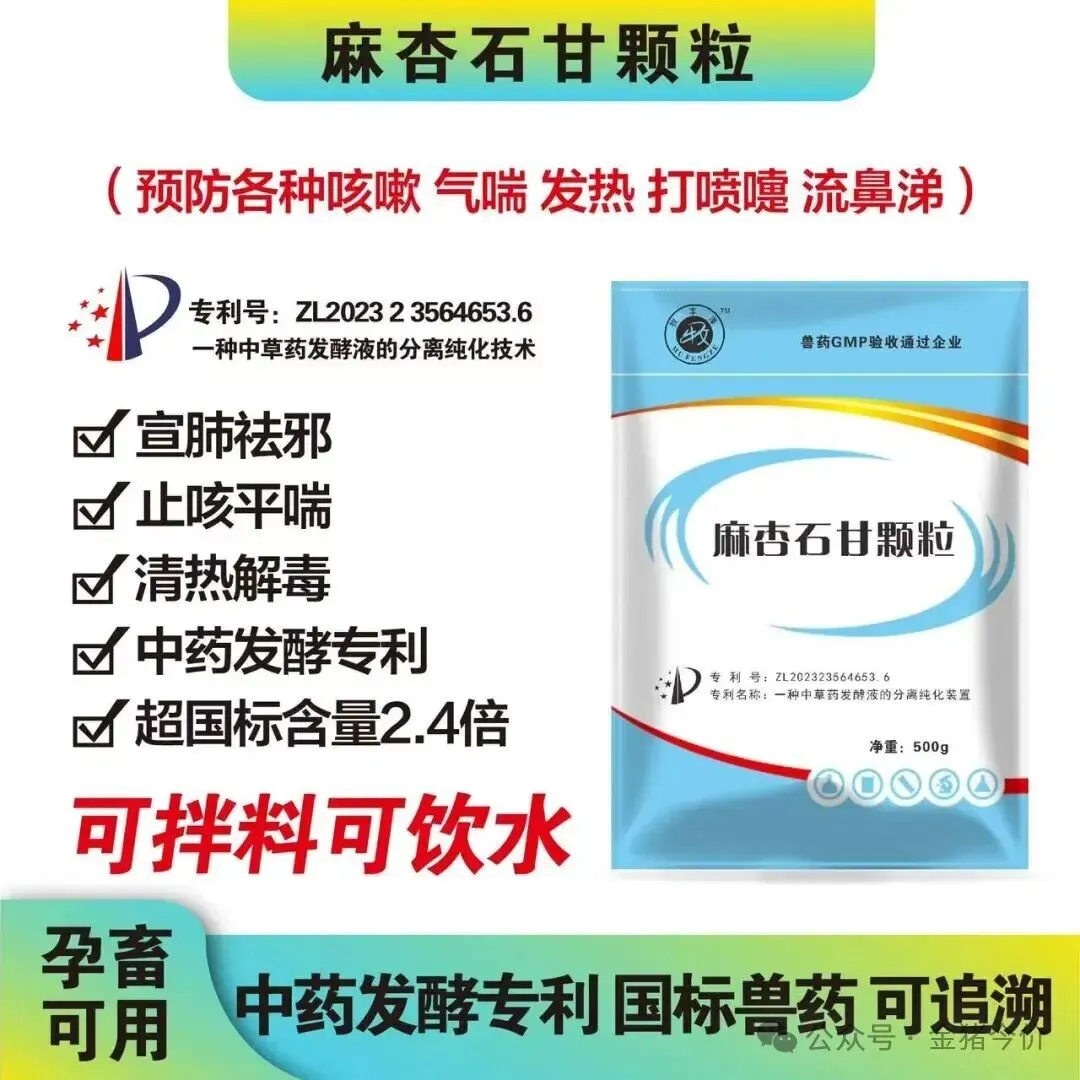 18、麻杏石甘颗粒——专利技术中药发酵液 分离纯化技术,预防呼吸道效果显著。↓ 规格:一件20袋,一袋500克,拌料1000斤,饮水2000斤 政策:5袋送1袋,一件送4袋,5件送1件