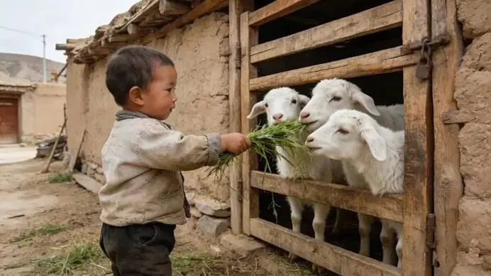 那一刻,我站在旁边,静静地注视着。所有关于羊的沉重记忆,爷爷雨中的疲惫、奶奶颠簸的小脚、风雪中的放牧、卖羊换粮的无奈……那些浸透着汗水与艰辛的往事,仿佛都被眼前这个稚嫩而纯真的画面温柔地包裹、化解了。羊,还是那种生物,但在不同的时代背景下,却承载了截然不同的意义。