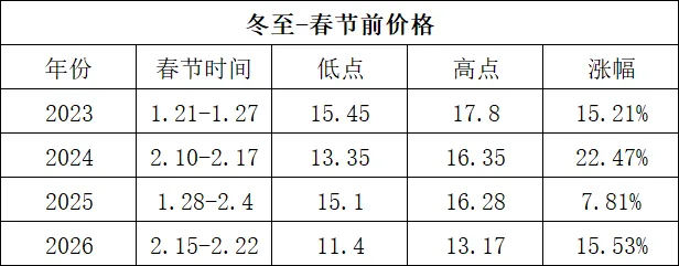 对于这波现货涨价,我原本以为今年供给量偏大,涨不了多少。也就是说,认为1月有涨,但是真没看涨那么多。那么这波涨价是否超出了季节性上涨的范畴?其实回顾近三四年现货行情会发现,冬至到春节前现货都有一波涨。从下表我们可以看到过去三年时间的涨价幅度,按照目前均价13.17计算,今年涨价幅度并没有超预期。