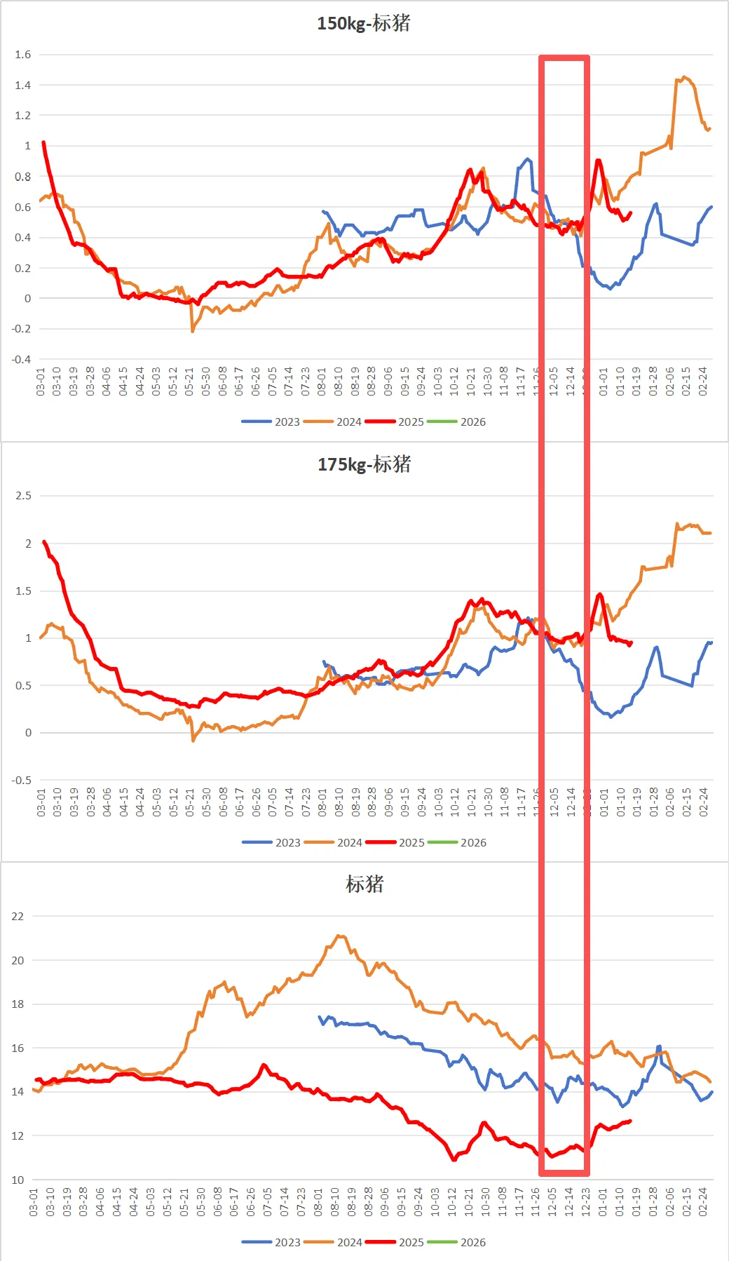 随后发生的是12月肥标价差止跌后的持续趋稳。按照季节性,12月消费逐渐回暖,冬至前达到阶段性峰值,对应这段时间市场大猪会积极出栏,而肥标差并没有随着供给端的持续释放继续走弱,至少能够说明短期市场大猪没有那么过剩,再次说明10月份前后库存得到了一定消化,同时也预示着后续季节性走高带动市场补栏、压栏情绪的可能性。