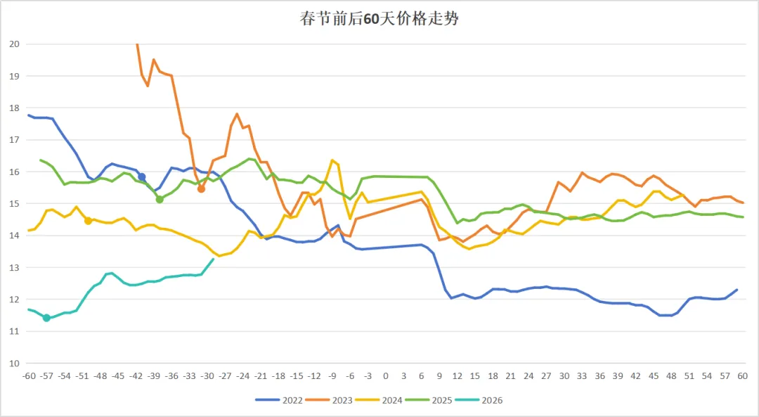 我们也可以看看近几年现货春节前后价格走势,可以发现春节后现货都还有个二次探底的过程。26年涨价没有超预期,那么春节后的跌价也将难以避免。