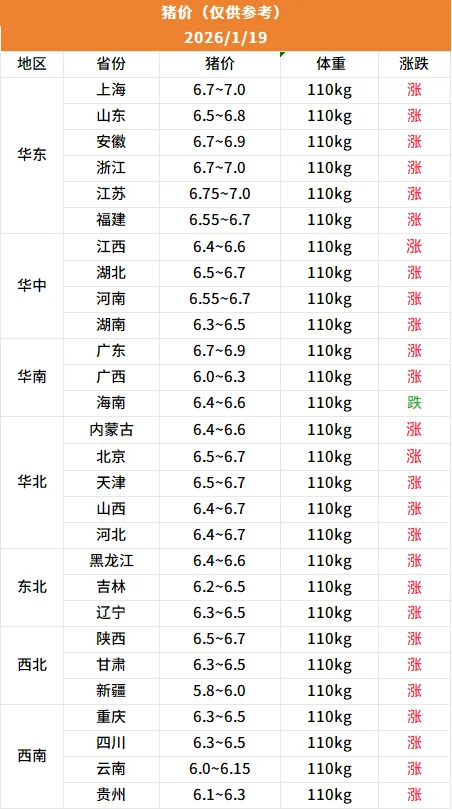涨!持续上涨!1月19日猪价 | 大部上涨,多地破7!