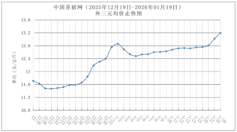 2026年01月19日(星期一),中国养猪网猪价系统数据监测如下:生猪(品种:外三元)均价为13.20元/公斤(6.6元/斤),价格较昨日上涨了0.18元/公斤(0.09元/斤);猪价环比上涨12.72%,同比下跌15.71%。
