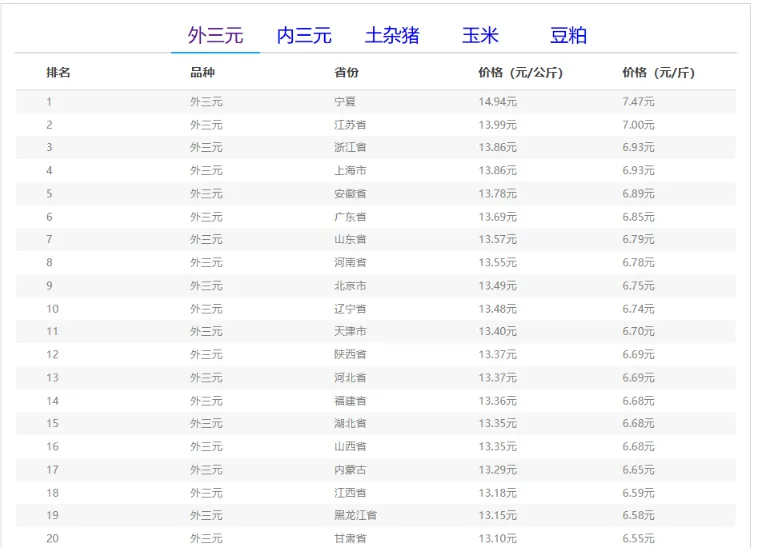2026年01月19日-中国养猪网生猪(外三元)均价排行榜