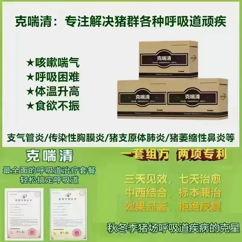 针对:支原体肺炎、传染性胸膜肺炎、巴氏杆菌(猪肺疫)、猪流感、肺炎链球菌引起的干咳、喘气、腹式呼吸、呼吸困难、皮肤发红发紫等效果显著,一针见效!!!