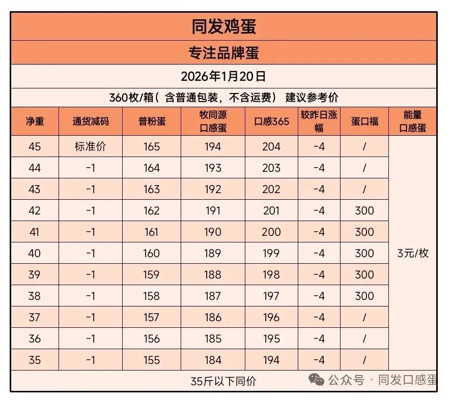 2026年1月20日贵港同发鸡蛋价格 养羊网 2026-01-20 2026年1月20日贵港同发鸡蛋价格以上价格为贵港同发鸡蛋平台公示的鸡蛋含包装成交结算价(上车价),仅供本平台渠道对接合作伙伴参考使用,不与其他任何报价做比较。 养羊网 2026-01-20 上一篇:猪价创4个月新高,肥猪仔猪集体上涨!今日全国各地肉猪、猪苗,牛羊鸡鸭鹅、蛋、禽苗和豆粕玉米等参考报价与行情资讯 (2026年1月19日) 下一篇:1月20日猪价 | 涨跌调整,大场出栏价格回落! 您可能还会对下面的文章感兴趣111: 相关文章 2025年4月13日全国各地生猪价格信息 怎么成为千万富翁? 坐标山东潍坊,计划在农村承包 300 亩农田 第39篇:什么是【猪周期】?