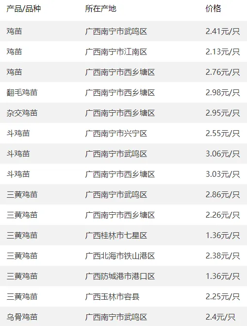 鸡苗市场全线下滑,情绪低迷。山东、河南、京津冀等主产区跌幅0.05-0.15元/羽,周口、商丘地区跌幅最大,达0.15元/羽,主流开票价1.15-2.90元/羽。仅峪口、广农等品牌小白鸡苗维持1.70元/羽,817鸡苗稳在0.78-0.90元/羽,苗企让利去库存态势明显。