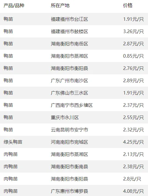 全国部分地区鸭苗价格参考