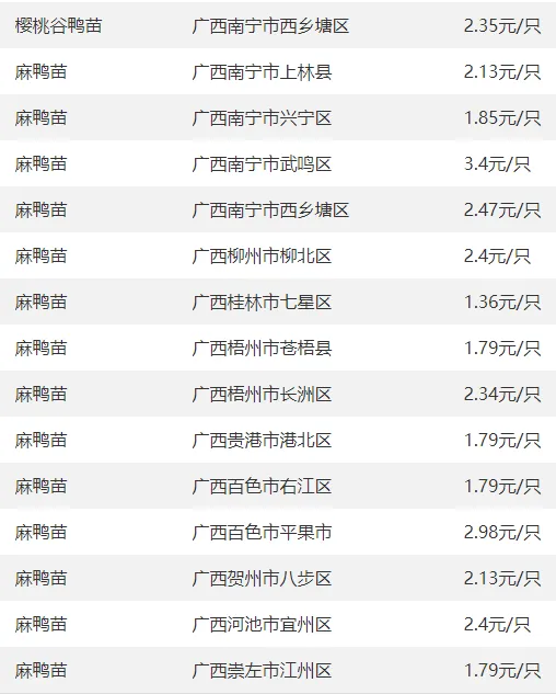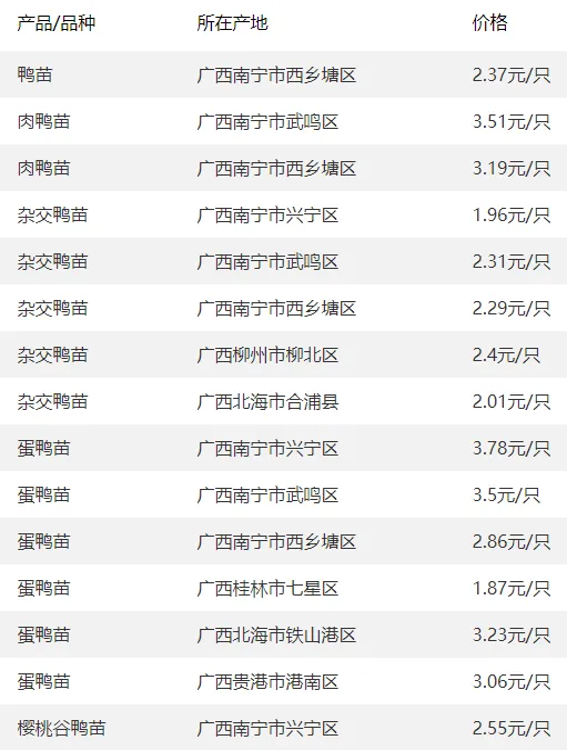 广西部分地区鸭苗价格参考