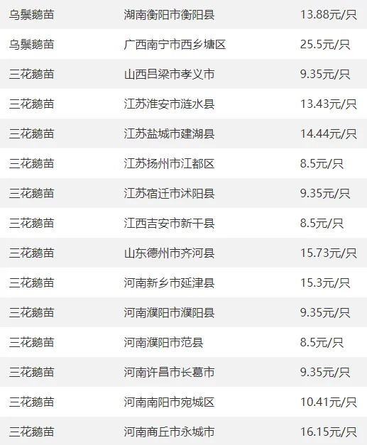 全国部分地区鹅苗价格参考