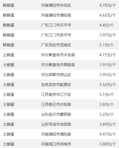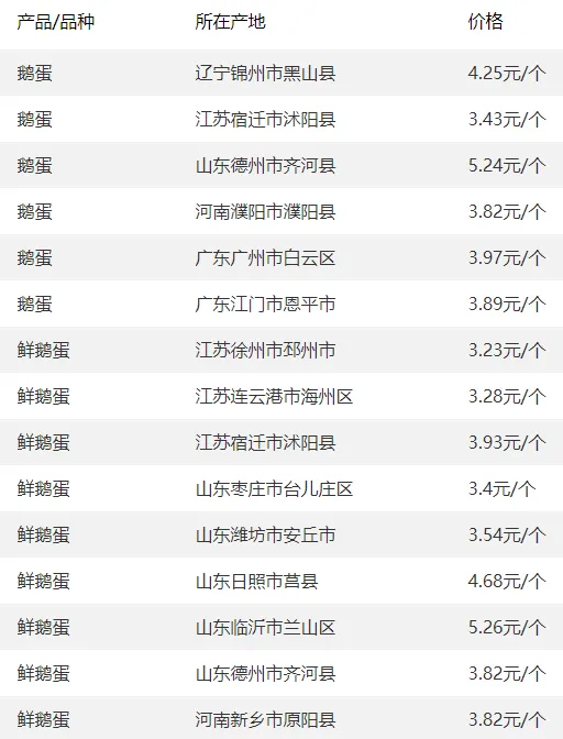 全国部分地区鹅蛋价格参考