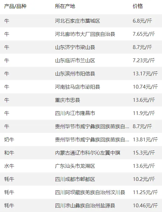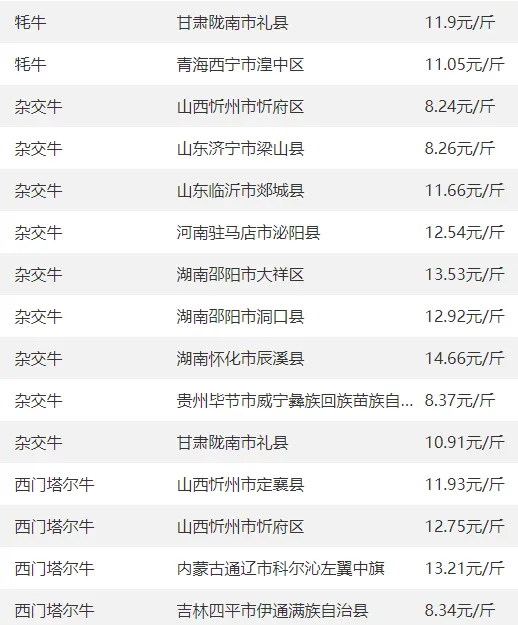 多地肉牛价格上涨,广东育肥牛14.1-16.2元/斤,西南、西北各省均涨0.1元/斤。