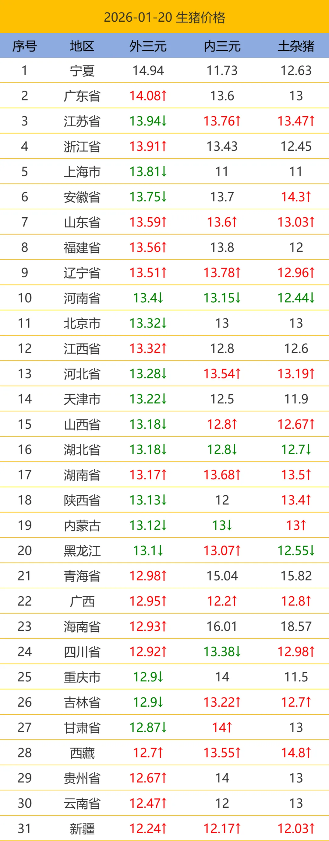 今日猪价.2026.01.20最新生猪价格/期货猪价 养羊网 2026-01-21 今日猪价.2026.01.20最新生猪价格/期货猪价以下猪价为平均价格(单位:元/公斤),仅供参考。 养羊网 2026-01-21 上一篇:全国猪价一片绿!!2026年1月21日全国猪价一片绿!! 下一篇:2026.1.21日-明天猪价 您可能还会对下面的文章感兴趣111: 相关文章 奥克兰鸡蛋,这个价格您爱了吗? 近期价格更新!!! ?购买土鸡蛋 衡水母羊销售