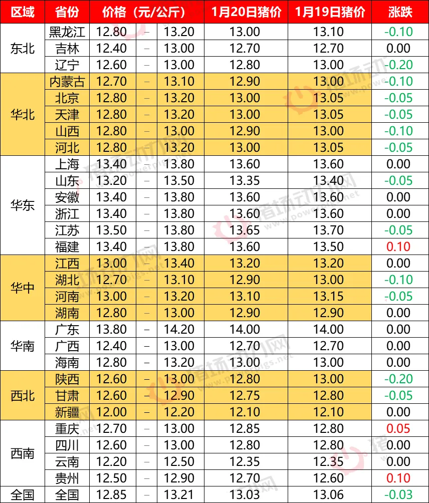 1月20日全国猪价略有回落【动力猪价】